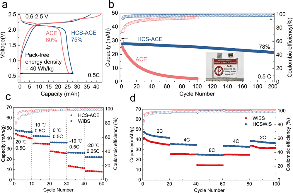 圖2. (a) 不同電解液下mAh級別軟包電池的首周充放電曲線,庫倫效率以及能量密度(HCS-ACE與ACE)。 (b) mAh級別的軟包電池在ACE和HCS-ACE電解液下的循環性能。(c) HCS-ACE與高濃度水系電解液的全電池低溫性能對比。(d)HCS-ACE與高濃度水系電解液的倍率性能對比。