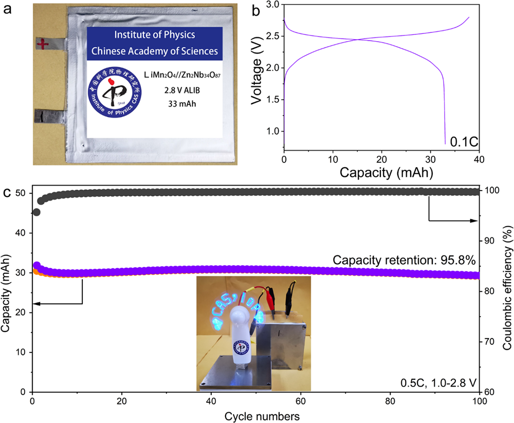 圖4. 33 mAh容量LiMn2O4//Zn2Nb34O87軟包電池電化學性能